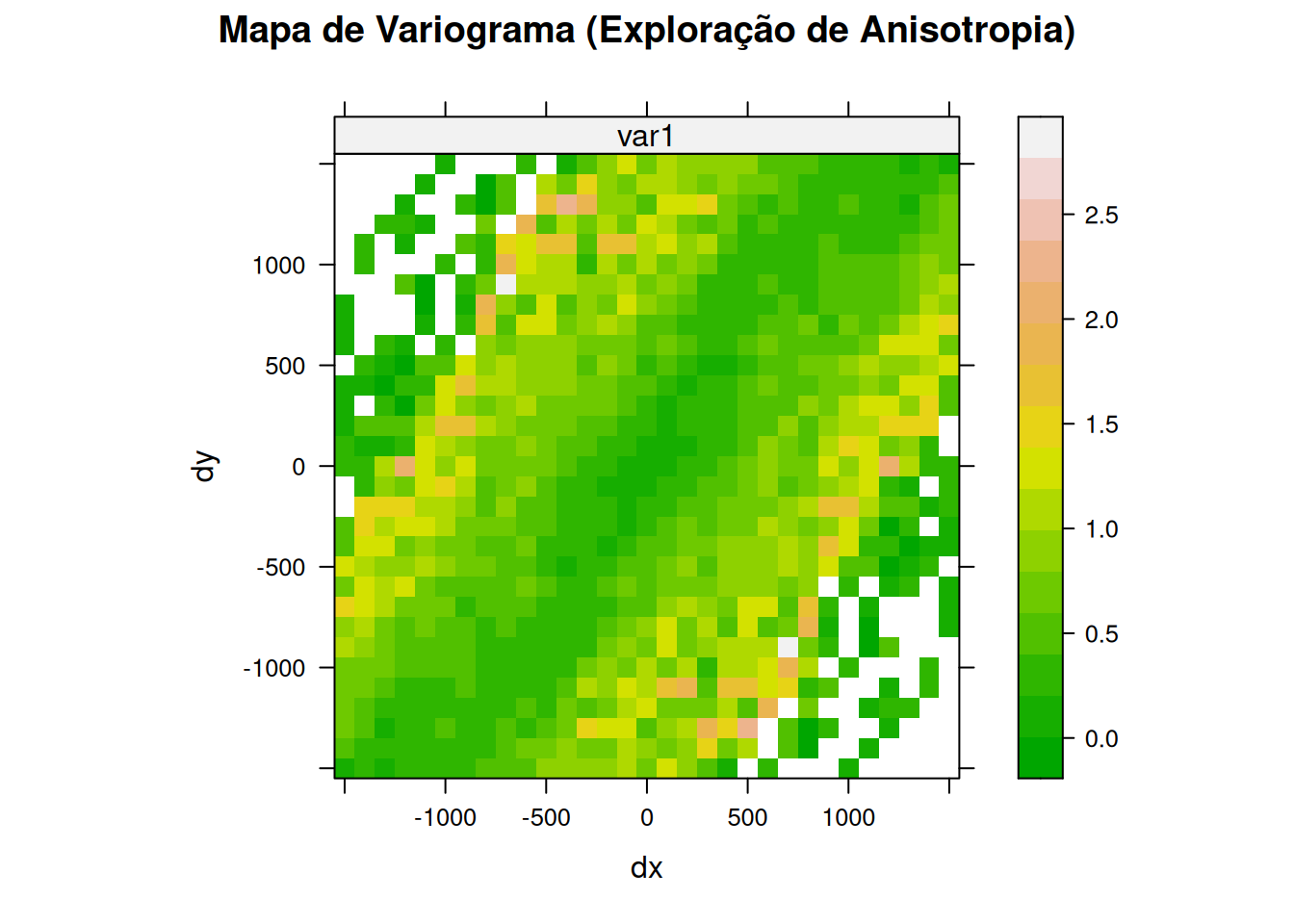 A anisotropia ocorre quando a continuidade espacial não é a mesma em todas as direções. O Mapa de Variograma (ou variogram cloud map) permite visualizar tendências direcionais.