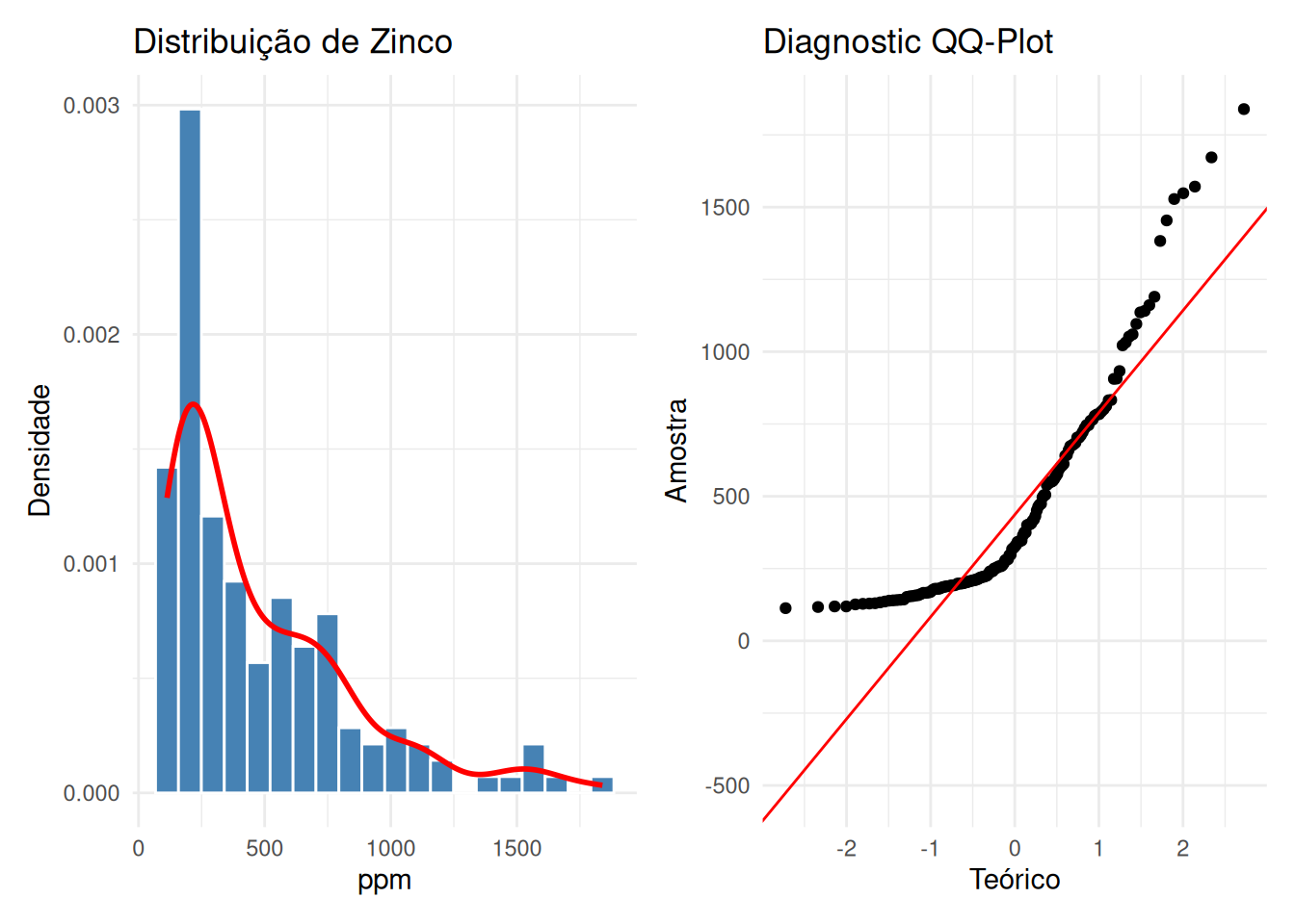 Uma assimetria superior a 1 ou 2 indica a necessidade de transformação. O Zinco, neste caso, apresenta forte assimetria positiva.